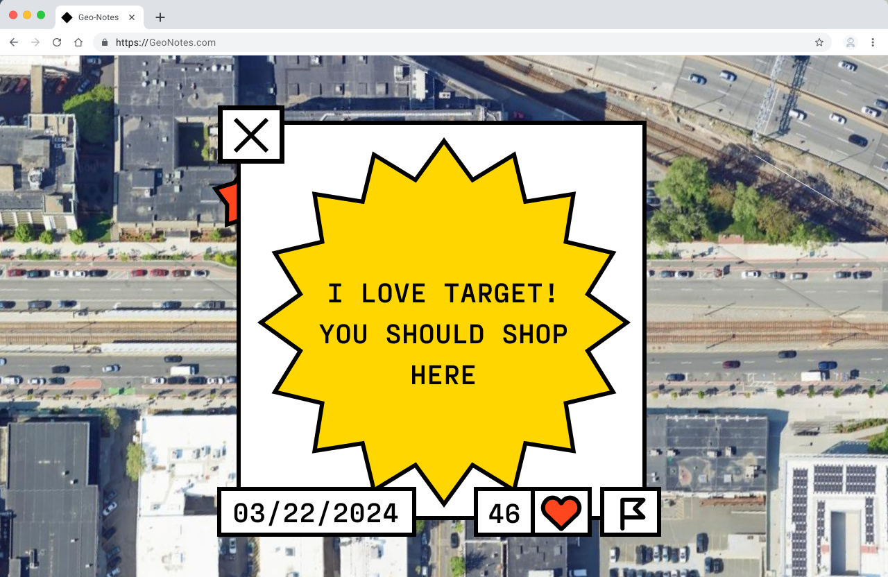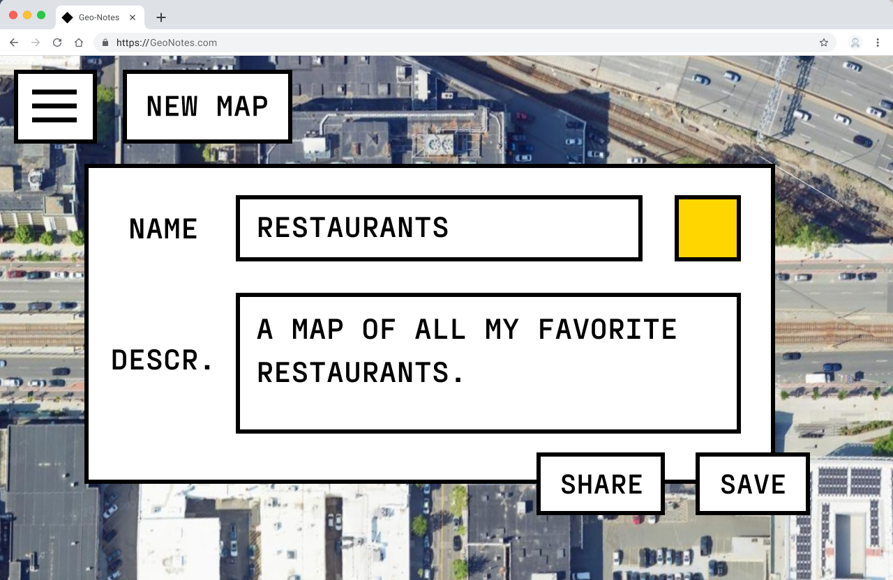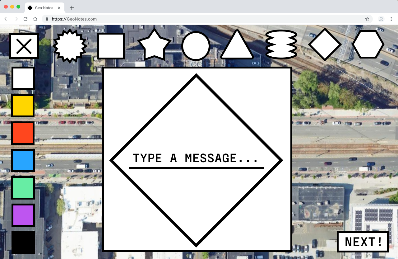 The visual language of Geo-Notes is meant to be fun, playful, and inviting. It is loosely inspired by retro internet aesthetics through the use of a monospace typeface, simple pop-up-window-like elements, fun shapes, and bright pops of cheerful colors.